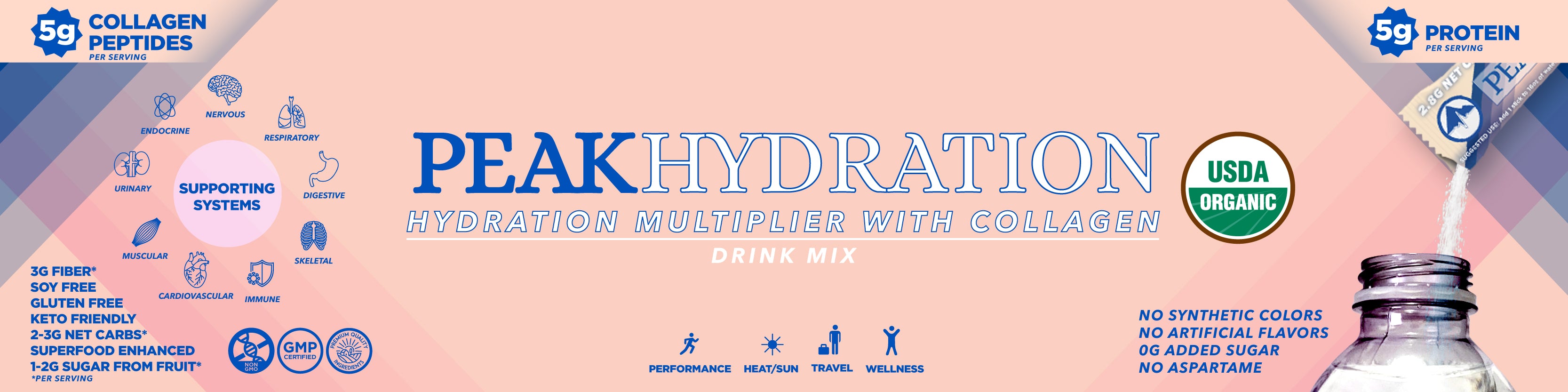 At Peak Hydration, we believe that staying hydrated should also support your overall wellness. Our Peak Hydration Multiplier with Collagen is a game-changer in hydration—an all-natural, certified organic, health-focused blend designed for those who care about what goes into their bodies. Packed with collagen, protein, antioxidants, anti inflammatories, fiber, pre and probiotics. This innovative formula delivers more than just hydration.